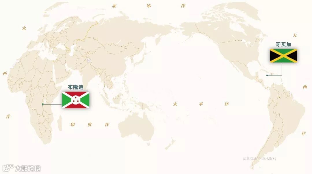 布隆迪位于非洲中东部,牙买加是加勒比海地区的岛国,两国国旗的x形都没有具体的意义。牙买加国旗的识别度会更高一些,记住博尔特的配色就记住了国旗的样子。剩下那个就是布隆迪了。