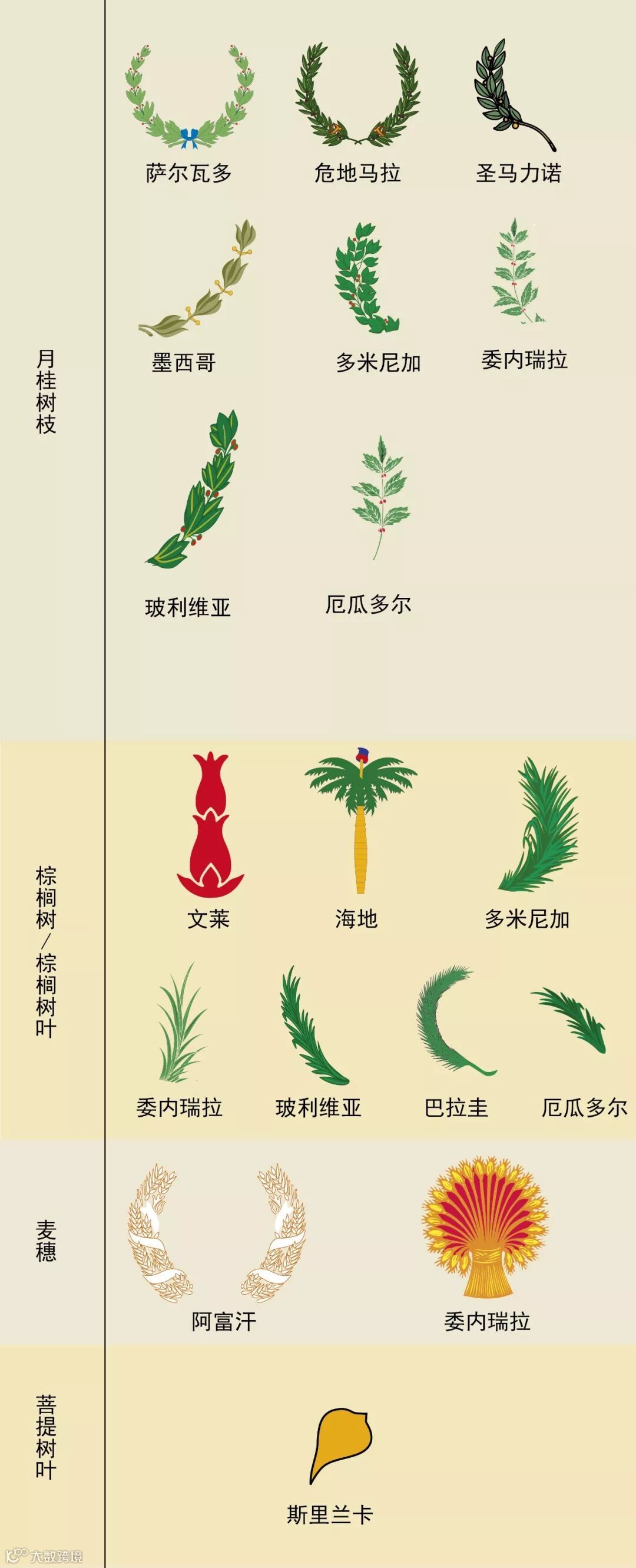 植物中出现最多的是月桂树枝,月桂传说是献给太阳神阿波罗的神圣植物,自远古时代就是欢乐的象征。月桂编织成的花冠被佩戴在诗人的头顶,月桂树枝则作为胜利的标志,经常出现在庆祝凯旋的场合中。