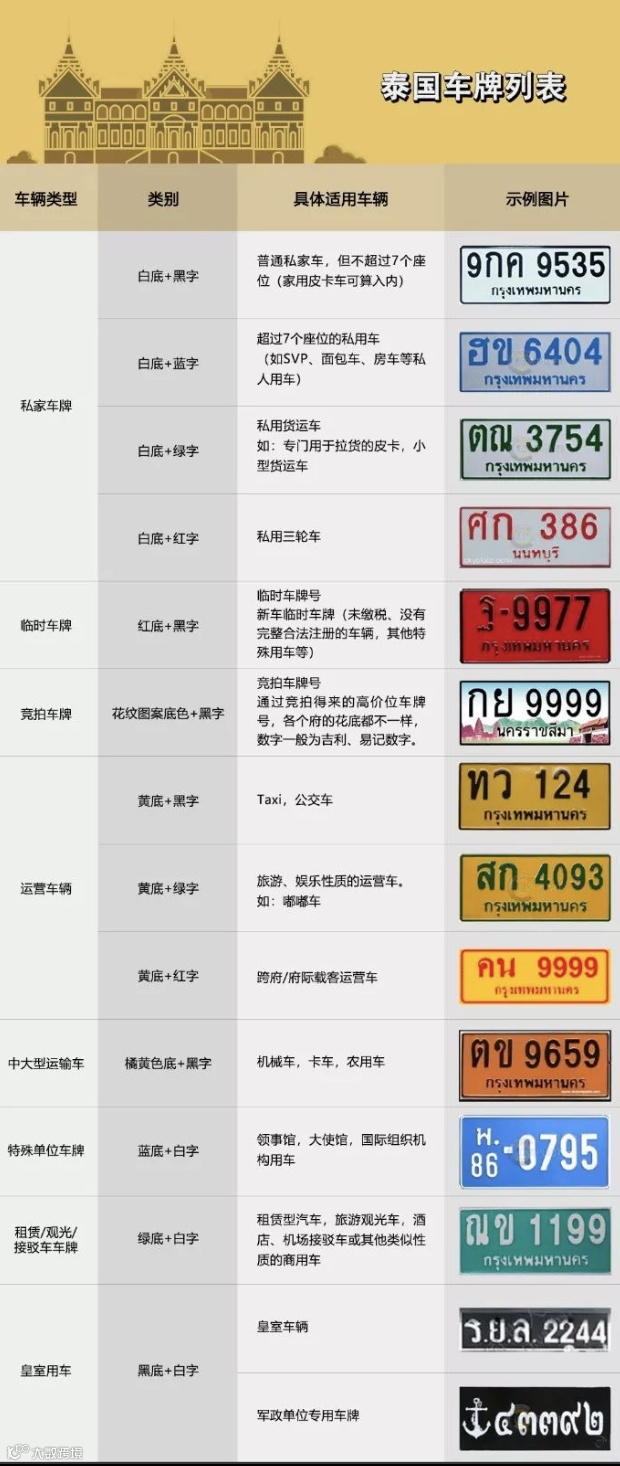 泰国车牌由泰文字母、阿拉伯数字及所属府名组成,材质为铝制,标准尺寸为15×34厘米[k]。背景颜色常见红、白、黄、绿及图案类,文字颜色多为黑、蓝、红、绿四种,不同颜色对应不同车辆用途[k]。