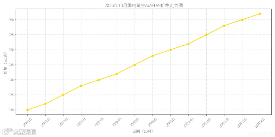:受国庆假期消费旺季推动,金价从925元/克温和上涨至935元/克,成交量同步放大。 - 第二阶段(10月8-10日)