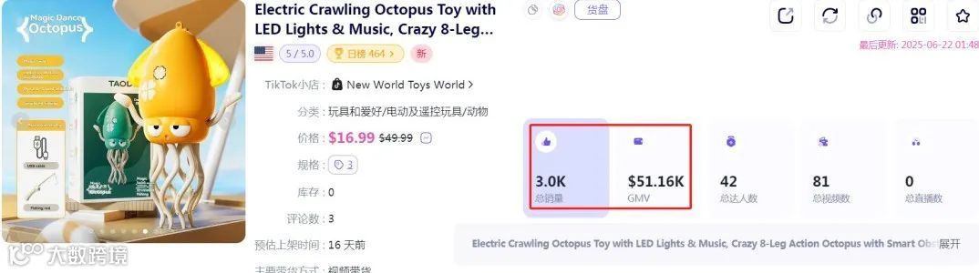 New World Toys World的章鱼形象电动玩具已实现超5.1万美元GMV(约合人民币37万元)[k]。