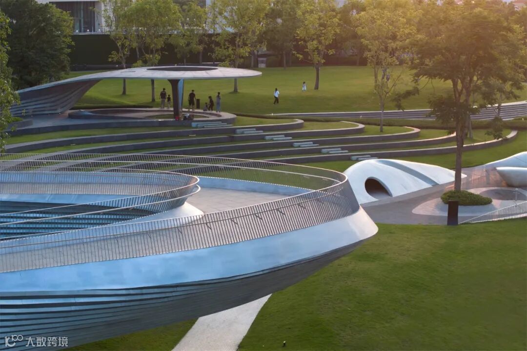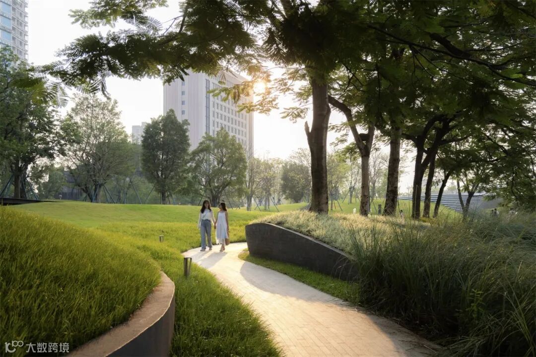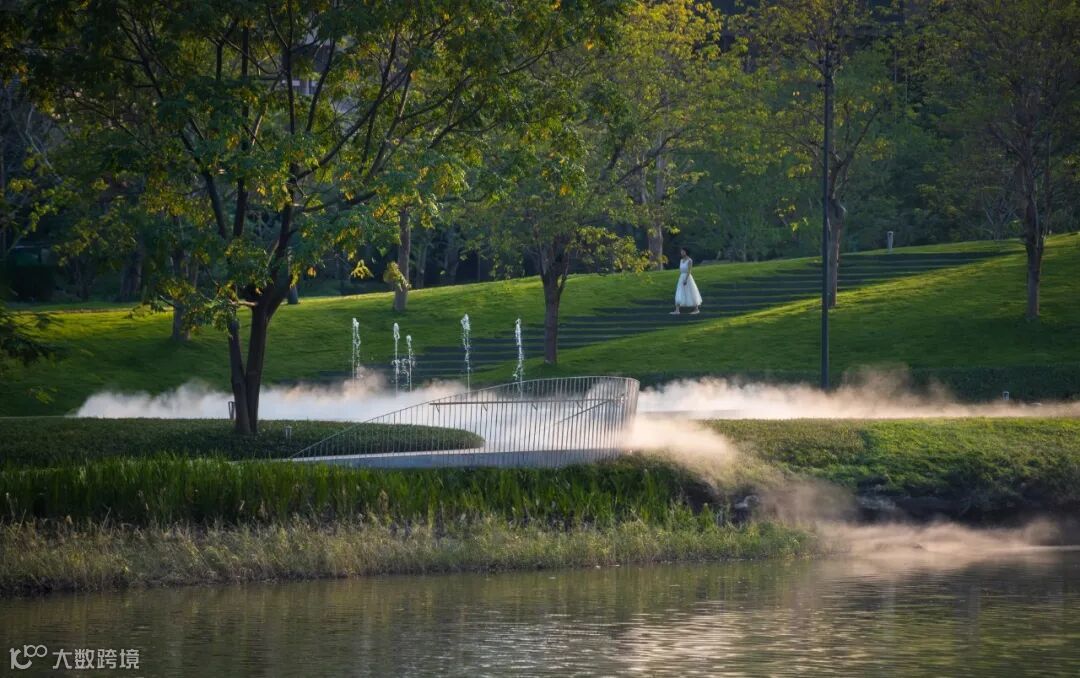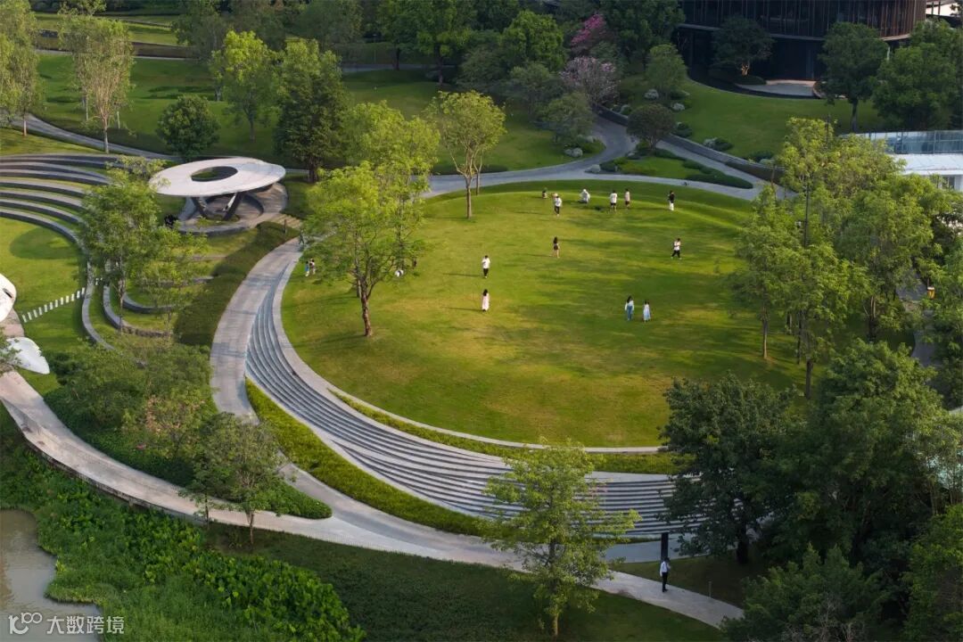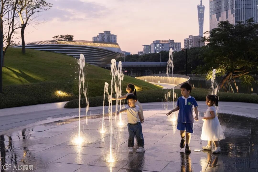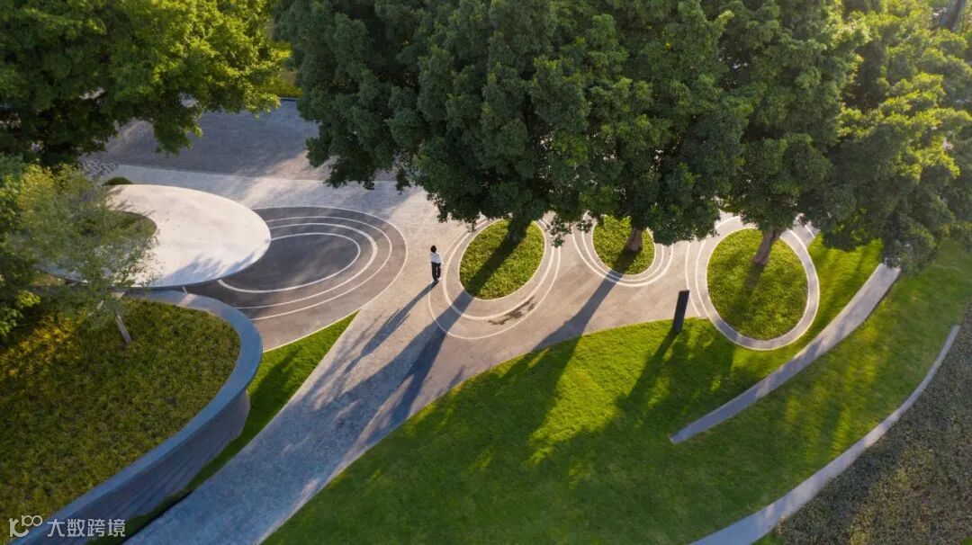 ↑水广场被茂密植被环绕,营造出清爽宜人的夏季活动空间