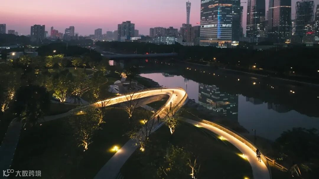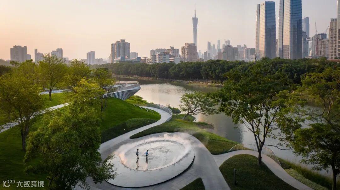 在公园东侧,一条高架步道穿越起伏的绿谷与森林,连接至一个水广场。 水广场被茂密植被环绕,营造出清爽宜人的夏季活动空间。 该广场可临时排水,变身为滨水舞台,举办各类公共活动。 上方步道向水边延伸,形成中央观景平台,俯瞰广州塔与城市天际线,成为滨水新地标与城市观景点。