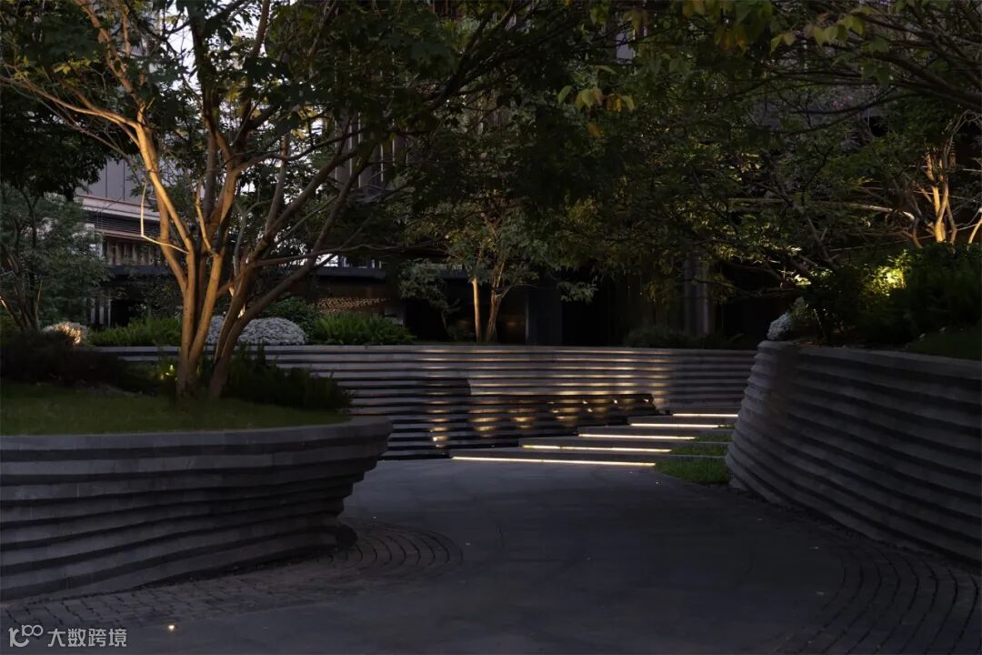 公园南侧,茂密的花园与精致的景墙营造出由开放公园走向私密花园的有机过渡,柔和地引导访客步入会所展厅区域。结合建筑布局,设计设置了两处动静结合的环绕式水景——一处静谧的镜面水池,一处灵动的跌水景墙,相互映衬。