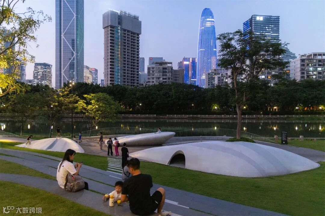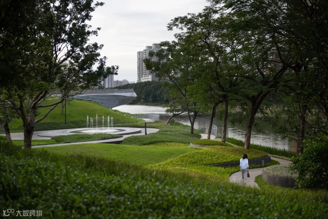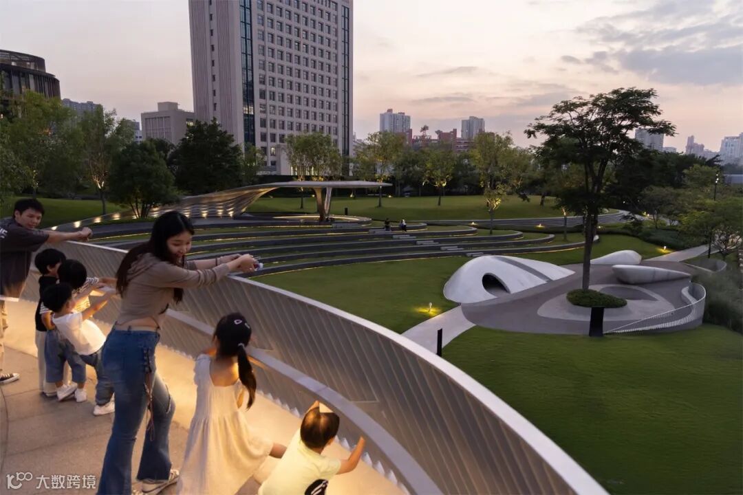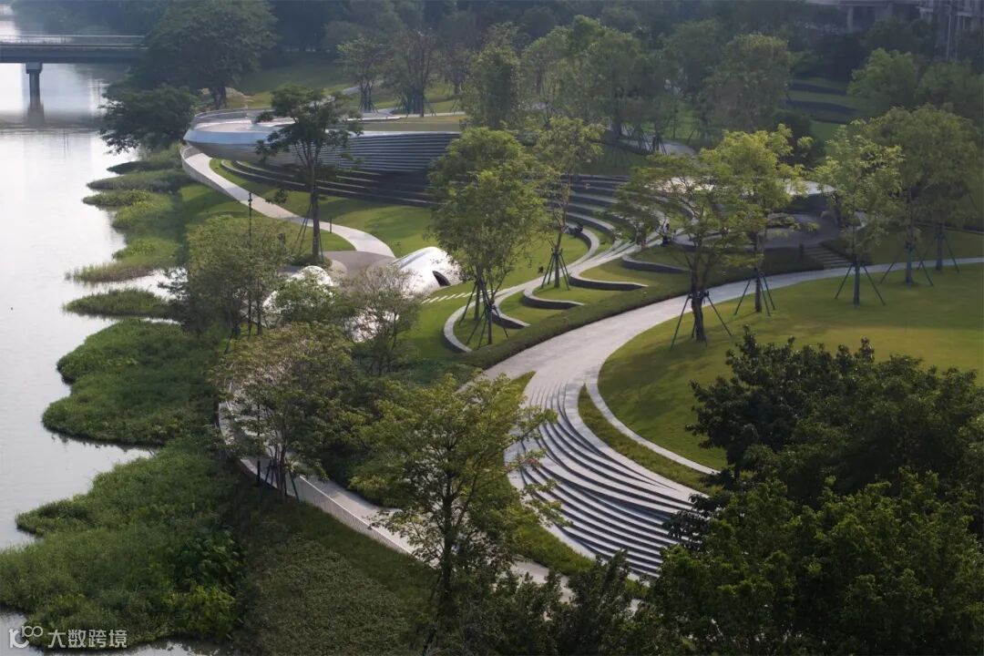 观景平台下方,是一座大型露天剧场,成为社区的聚会空间,西侧的大草坪可承载大规模的城市活动,并提供欣赏黄埔涌河与城市天际线的全新视角。 河岸边,一个以河石为灵感的社区游乐场在保留原有大树的基础上精心设计而成,丰富了公园的互动与亲子体验。