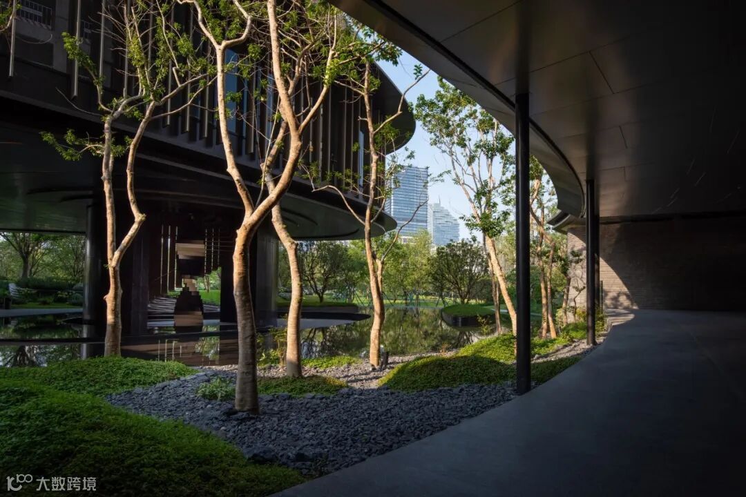 设计引入一座精致的半室内绿意庭园,绿植与水景结合通透建筑立面与室内外交错的流线设计,模糊室内外的界限,将公园的自然肌理与亲水体验引入建筑内部空间。公园的自然流动与季节变化成为建筑体验的重要组成部分。建筑室内的精致氛围与城市远景的活力气质交织共融,构建出一个自然、建筑与都市互为融合的沉浸式空间。