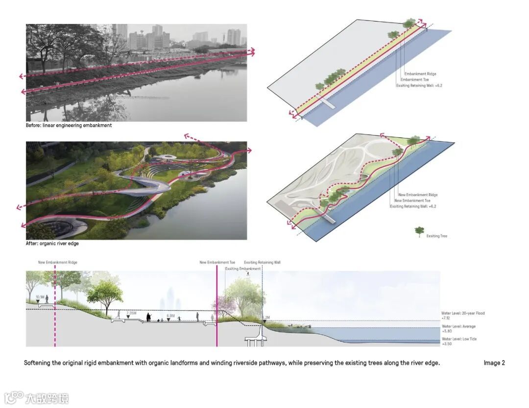 在充分理解防洪要求的基础上,设计通过引入有机的地形形态与蜿蜒的滨水步道,柔化了原有的硬质线性堤岸结构。 通过精心安排功能空间与植物配置,设计顺应并拥抱自然水位的动态变化,实现了景观、人与水体的有机融合。 地形与步道的布局经过细致推敲,最大程度地保留了滨水岸线原有的十四棵郁郁葱葱的大树。