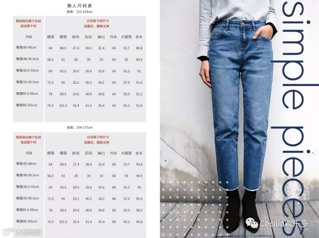 所有裤装都有两种裤长,分别对应153-164cm,164-175cm;每个裤长有5-8个臀围,买裤子困难户的福音!
