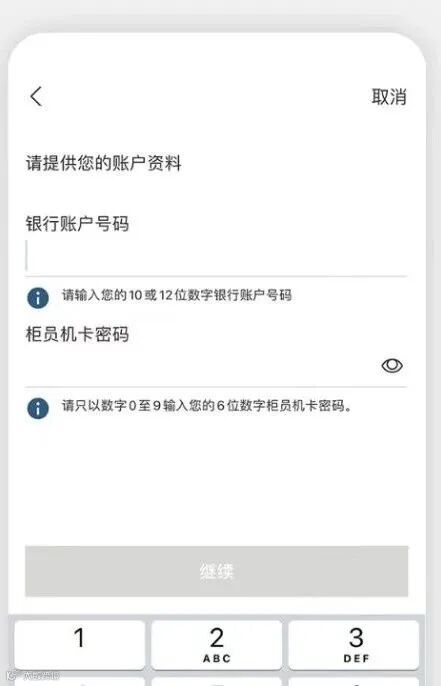 2、输入你的账户号码,自动柜员机卡密码及身份证明文件号码。