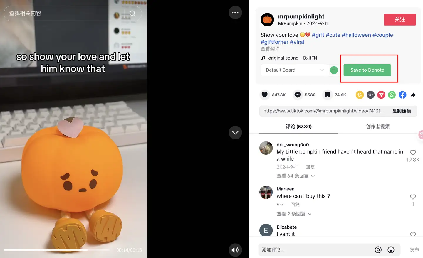 如果你在TikTok搜Pumpkin Night Light,会发现随便点开一条视频就有10万+播放,上万收藏。视频主角正是这只面露难色的南瓜小夜灯。