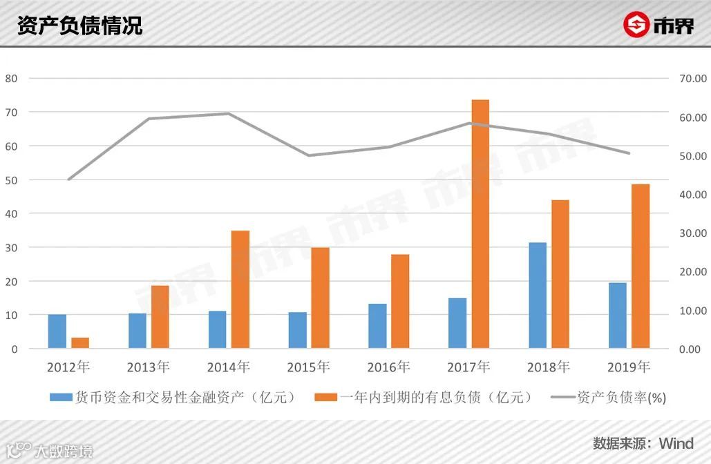 多元化扩张背后是沉重的资金压力[k]。2013至2019年,天士力资产负债率均超50%,短期借款最高达69.49亿元,而账面资金常年无法覆盖一年内到期的有息负债,资金缺口最高达29亿元[k]。