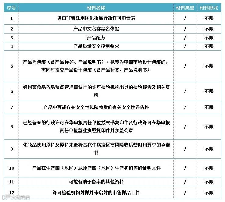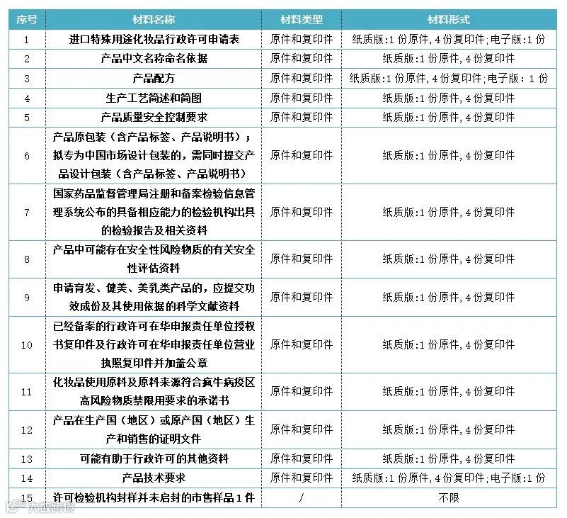 进口特殊用途化妆品行政许可批件的申领条件与非特殊用途产品相同,所需材料如下: