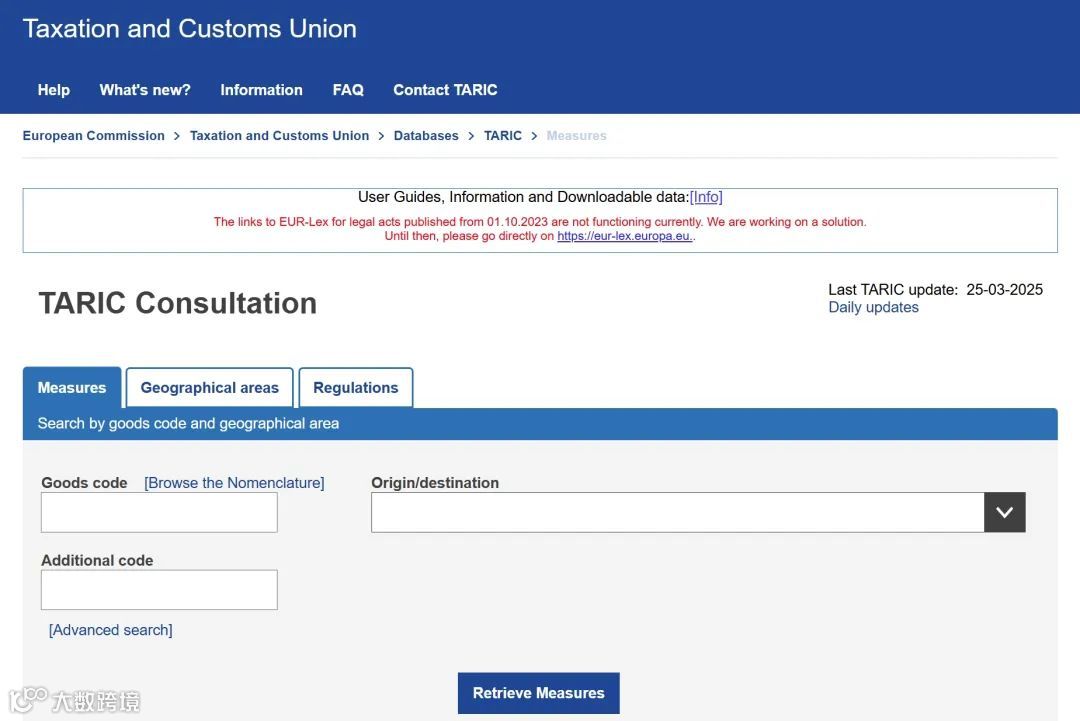 值得注意的是,欧盟针对中国部分商品实施了一系列制裁措施。这些制裁内容已被系统地整合到DG TAXUD TARIC数据库中。