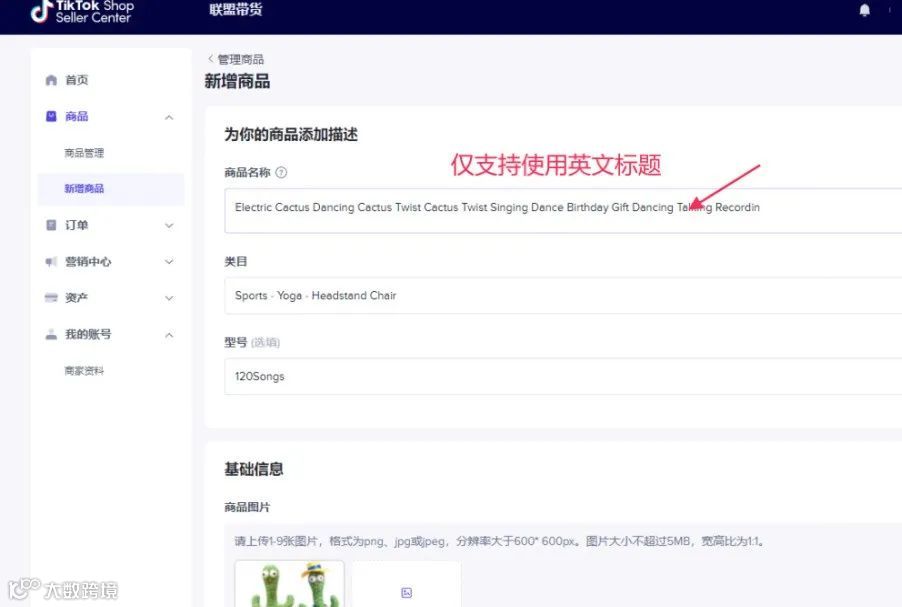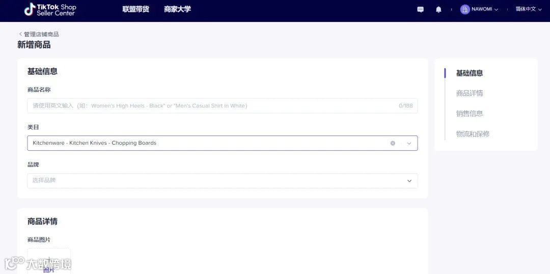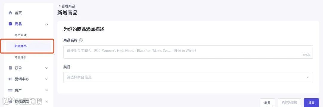 点击【新增商品】可开始发布新品,需填写英文商品名称、类目、简介及清晰图片[k]。