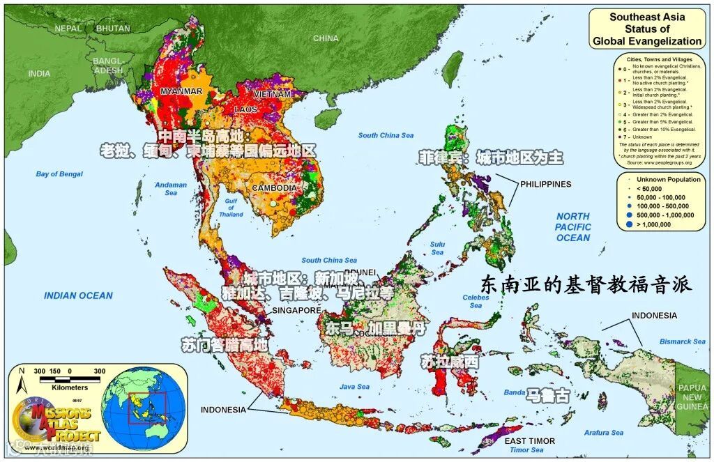 在东南亚的高地,新教的传教者在20世纪初就已经通过社会服务在当地广泛传播基督教,甚至帮助一些民族创制了自己的文字,推动民族意识的形成。其中,缅甸的克伦邦、克钦邦、钦邦等高地地区,20世纪初都曾经是基督新教重要的传播地,目前已经是东南亚主要的新教地区。同时,在缅甸、老挝的高地依然有许多人保持万物有灵信仰,近年来开始在周边民族影响下,接受新教作为信仰。此外,在印尼苏门答腊、加里曼丹等地的达雅克人、巴达克人地区,新教福音派同样增长较快。