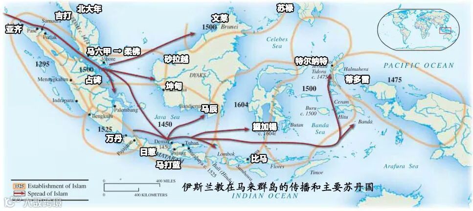 15世纪时,室利佛逝的后裔,马六甲王朝的王室接受了伊斯兰教,成为马六甲苏丹国,继续扮演着辉煌的贸易中心角色,同时也成为伊斯兰教在东南亚传播的中心。到了16世纪,一批苏丹国已经在马来半岛、苏门答腊岛、爪哇岛、苏拉威西岛、加里曼丹岛、棉兰老岛、苏禄群岛、马鲁古群岛等地建立,伊斯兰教在马来群岛大部分地区取得了统治地位。