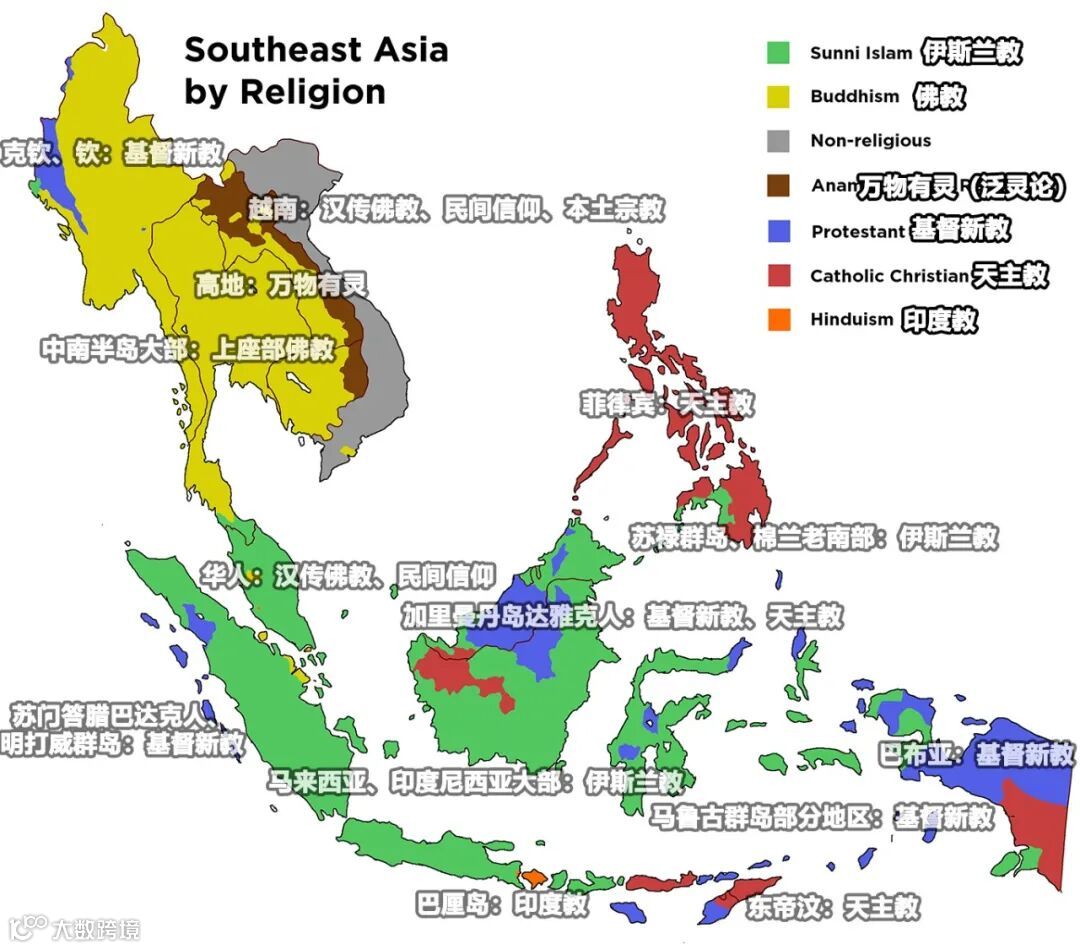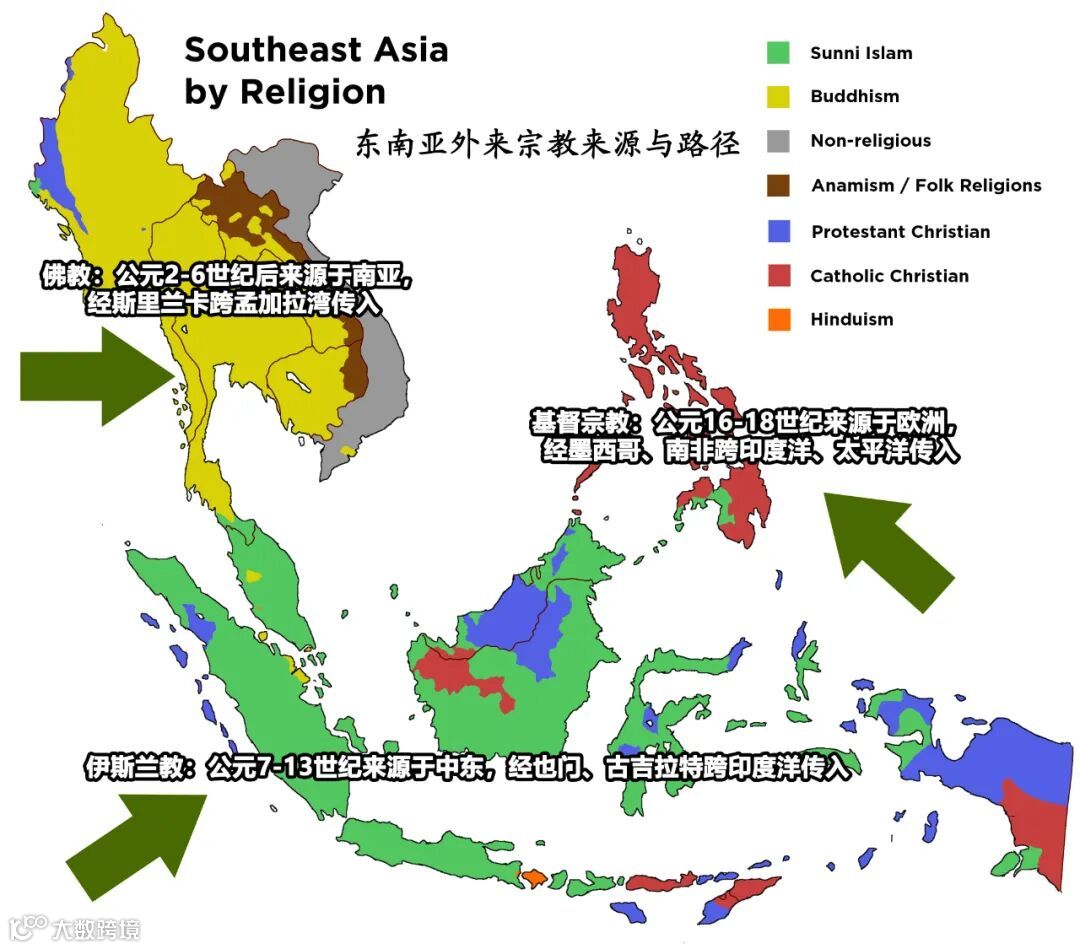 随着东西方海洋贸易的兴起,中南半岛、马来群岛由于自然环境、地缘政治上的差异,在国家政治结构、文化方面出现了明显的不同,宗教作为重要的意识形态和国家建构的工具,也在两大地理单元出现了分化。