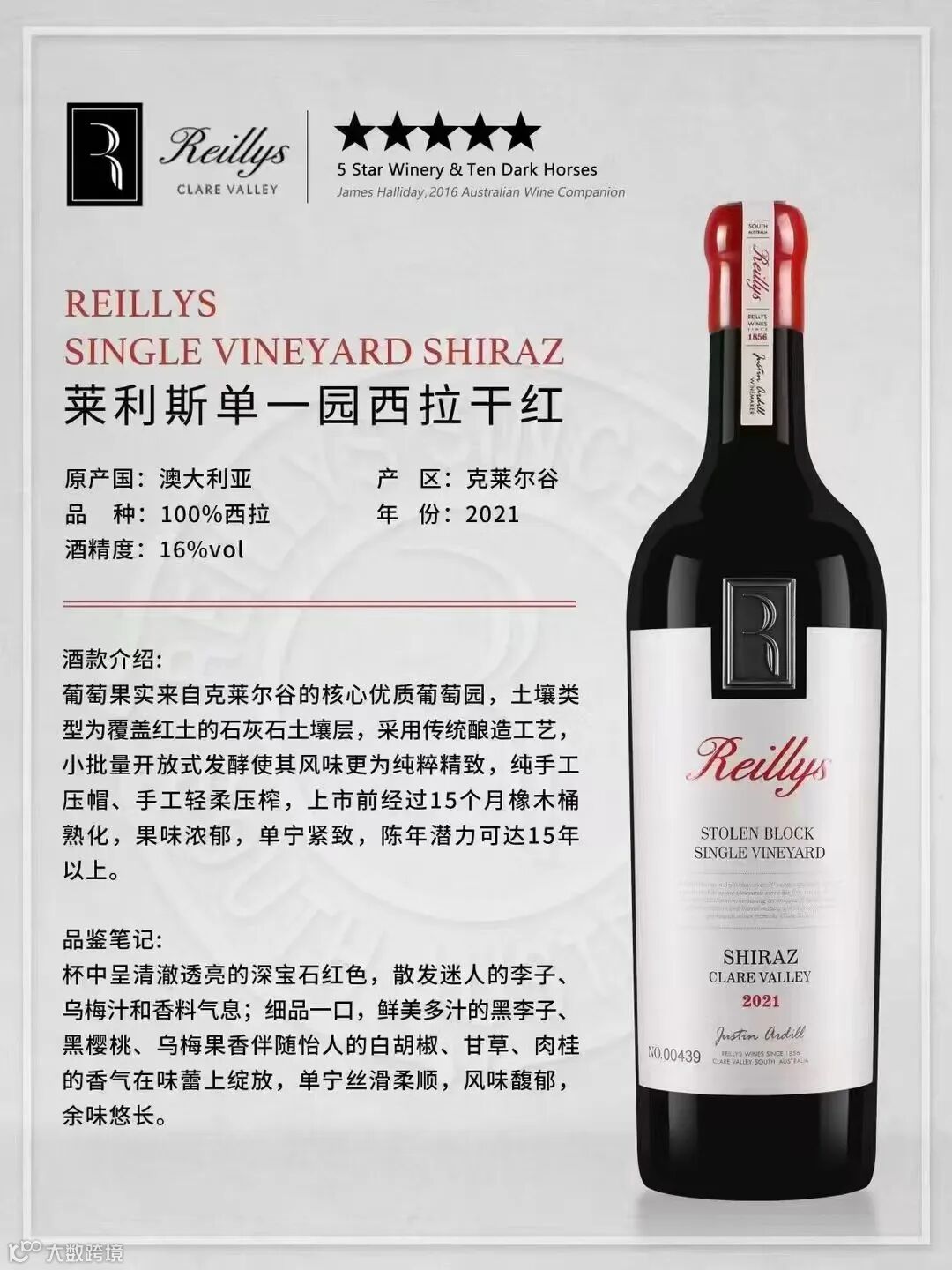 莱利斯单一园西拉干红葡萄酒澳大利亚REILLYS SINGLE VINEYARD SHIRAZ品鉴笔记: 杯中呈清澈透亮的深宝石红色,散发迷人的李子乌梅汁和香料气息;细品一口,鲜美多汁的黑李子、黑樱桃、乌梅果香伴随怡人的白胡椒、甘草、肉桂的香气在味蕾上绽放,莱利斯单一园西拉干红葡萄酒澳大利亚REILLYS SINGLE VINEYARD SHIRAZ单宁丝滑柔顺,风味馥郁,余味悠长。 Rel;g STOLEN BLOCK SINGLE VINEYARD SHIRAZ CLARE VALLEY 2021 N0.00439 Hsim hrdb CU SNCE