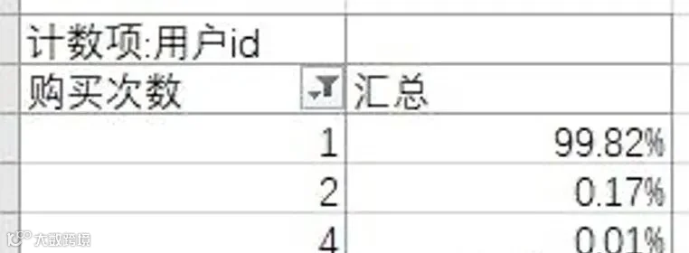 下图可以看出用户复购率极低,只达到了0.18%。需要进一步分析找到复购率低的具体原因,想办法提高用户复购率。