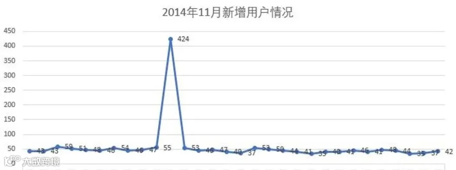 下图整理了新增用户情况,可以看到用户增长数量相对稳定,11.11这天用户增长是平时的将近10倍,说明双十一的推广活动效果明显,可以多进行这类推广活动。