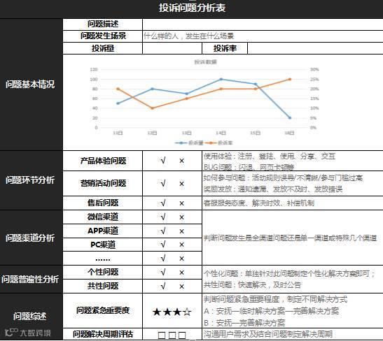 发现问题始终是解决问题的第一步[1]。在用户投诉发生后,需第一时间开展定量与定性分析:通过数据指标如投诉量、投诉率、时段趋势等评估问题严重性;通过场景分析明确问题发生的环节与普遍性[1]。
