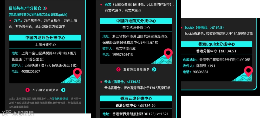 TikTok官方合作物流为万色物流,支持国内7个分拨仓(东莞、义乌、上海、泉州、杭州、香港)上门揽收或自行寄送[[k]]