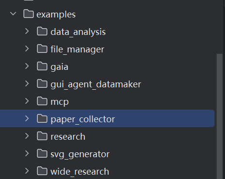 安装完成后便可以启动WEB端啦,这里需要注意,在exmaple的目录下涵盖了多种类型的Agent,这里我们选择Wide Search类型(当然用户可以根据自己的实际场景来定制Agent):