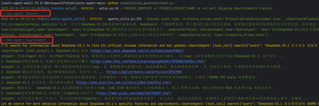 接下来就是SearchAgent来完成各项子任务,整个过程SearchAgent会读查找的结果进行分析、判断,是否有足够的信息来回答问题,这些信息最后再由Reporter进行总结。该问题最终会生成一个SVG的文件,将DeepSeek V3.1模型的特性进行展示,效果如下图所示: