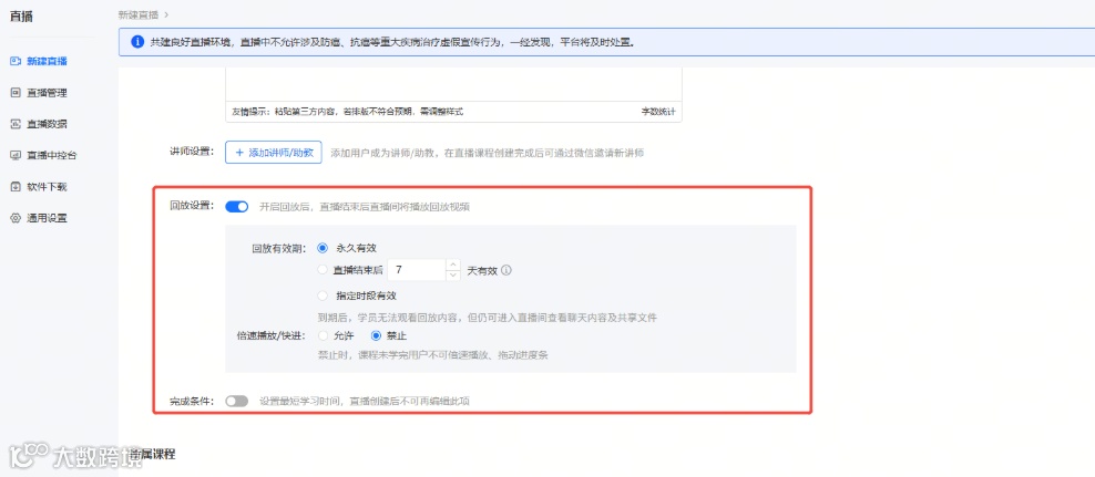回放设置(横屏/竖屏直播):开启允许回放后,直播结束后再次进入直播间将会回放视频;