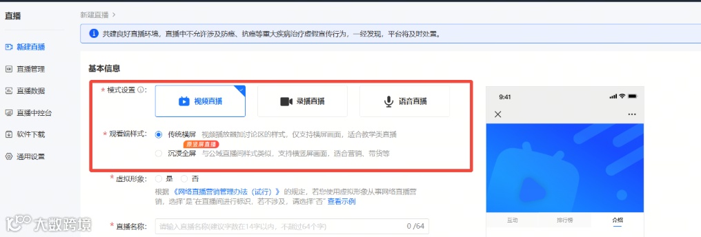 ①【视频直播】-【传统横屏/沉浸全屏】,开始直播前仍可切换模式,开始后将不支持切换;
