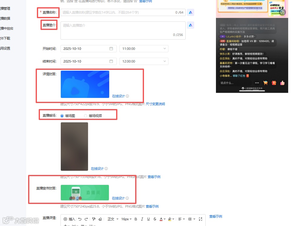 包括“直播名称、直播简介、直播时间、详情封面、直播暖场图/暖场视频、直播宣传封面、直播详情、讲师添加”等信息。