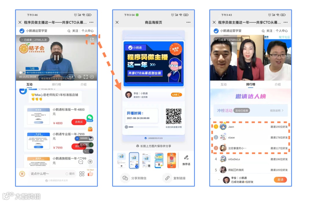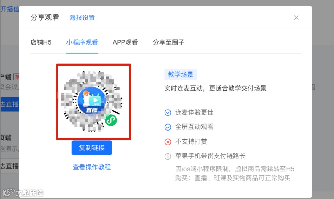 学员可以通过微信h5、小程序、pc端(需要商家开通旗舰版套餐才能在pc端上看直播)、app端等方式进行开直播,取决于商家分享给你的链接是二维码、小程序码还是链接,很多用户问我要怎么生成海报专属链接进行分享,看下面的图解