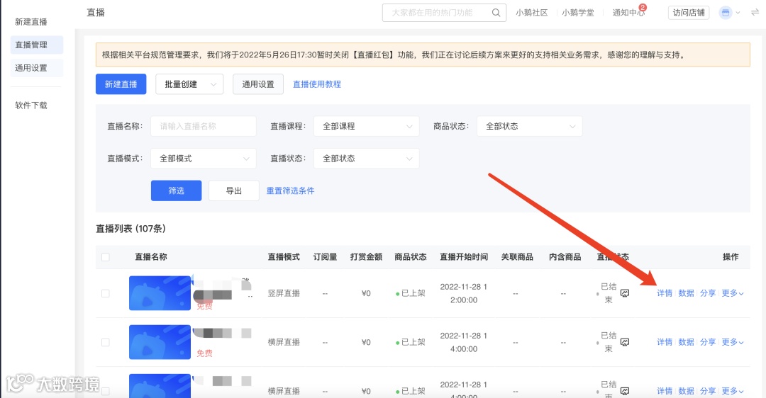 完成课程创建后,可以选择前往“详情页”进行更多设置,可以点击“去直播”;