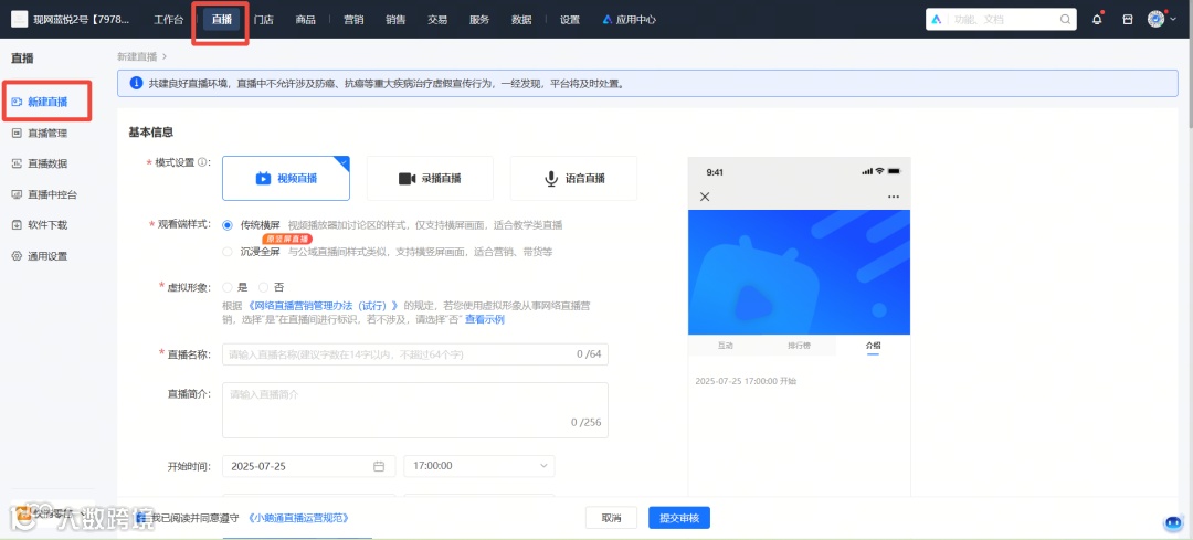 1)进入商家管理后台,选择【直播】-【新建直播】,填写信息后完成直播间创建,并进入直播间详情页;