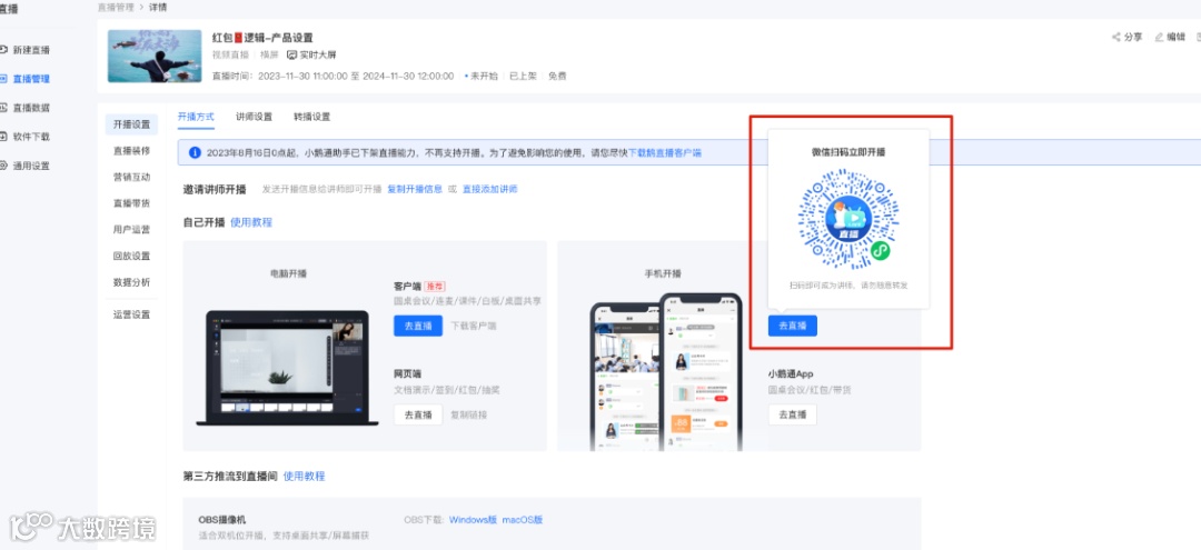 进入【开播设置】-【开播方式】后,点击【手机开播】模块下的【去直播】按钮,打开手机微信扫码即可进入直播间并自动成为讲师。二维码支持分享给好友,好友扫码后自动成为直播间讲师