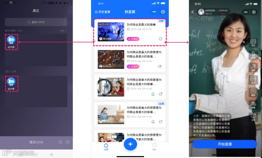 1、讲师微信搜索鹅直播小程序,可以查看到自己名下直播,点击进入可以开始直播;