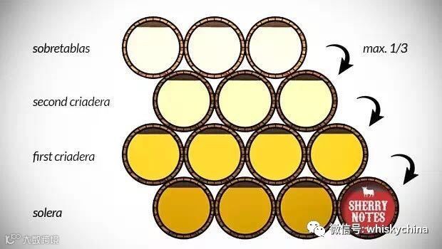 索雷拉酿造法最先起源于雪利酒,后来被推广到多种烈酒的酿制中。根据年份不同,将酒桶分层摆放,每次装瓶从底部高年份酒桶中抽出部分,再用上层低年份酒补足,层层互补达到风味平衡的效果。