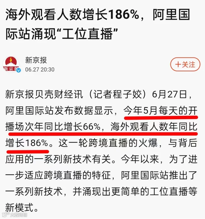 据报道,阿里国际站今年5月每天的开播场次年同比增长66%,海外观看人数年同比增长186%。