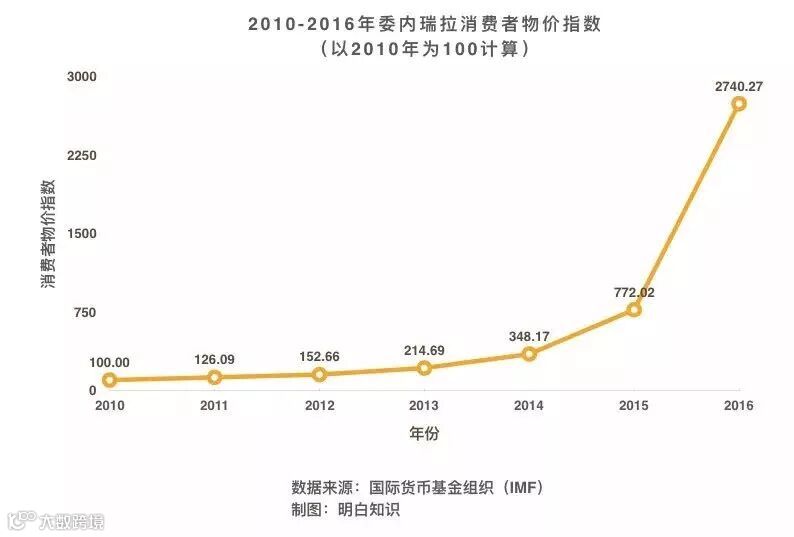 2017年,委内瑞拉的CPI是946%!以2010年为基数,到2016年短短6年,委内瑞拉的CPI指数上涨了27.4倍。