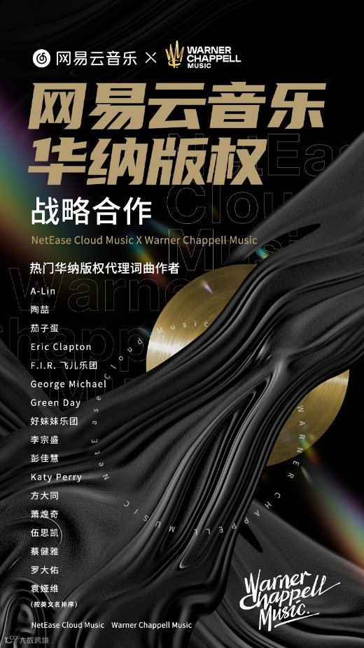 5月12日,网易云音乐宣布与华纳版权(WCM)达成战略合作,华纳版权为世界三大唱片公司之一华纳音乐集团旗下的国际词曲版权公司。