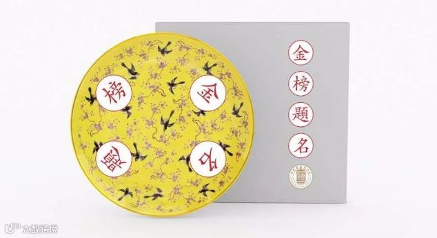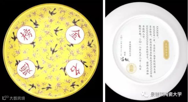 瓷盘以粉彩装饰,口沿以内施黄釉