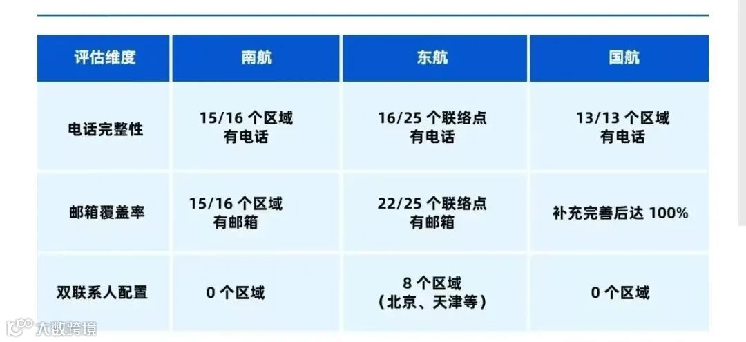 服务便捷性:国航(电话 100% 覆盖)>南航(邮箱 100% 覆盖)>东航(部分联络点缺联系方式)。
