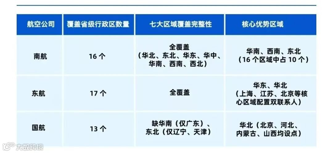 覆盖广度:东航(17 省)>南航(16 省)>国航(13 省),但南航的区域均衡性最优。