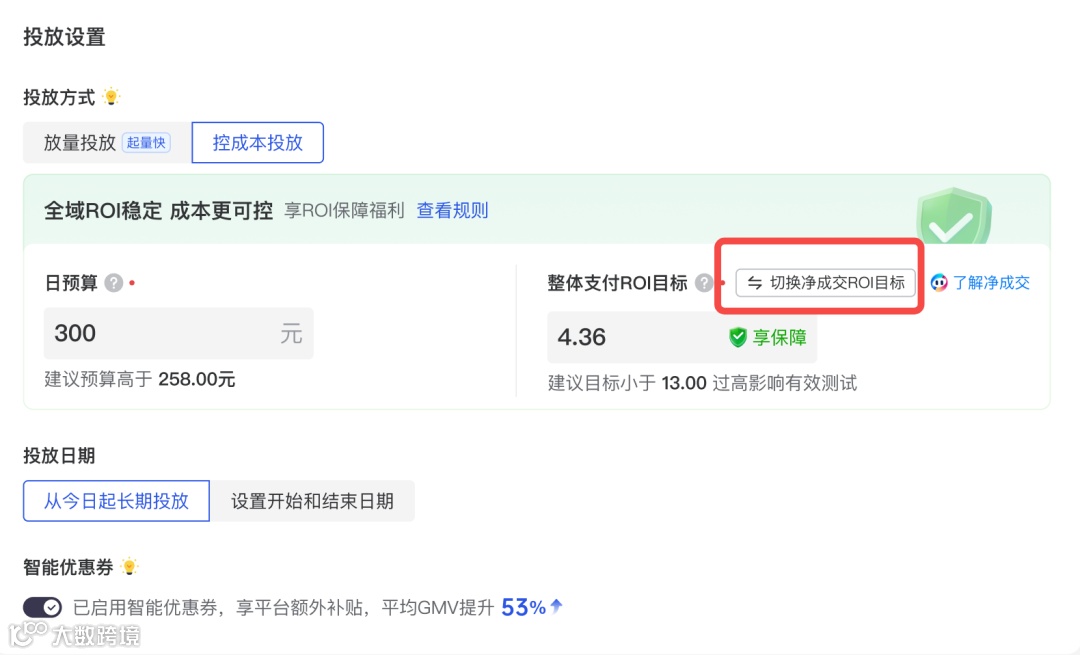 由于整体支付ROI和净成交ROI二者优化目标不一样,开启净成交时建议参考系统建议ROI。系统建议净成交ROI=系统建议支付ROI*净成交结算率,并不是下调ROI目标,因此可放心采纳,保持投放竞争力。