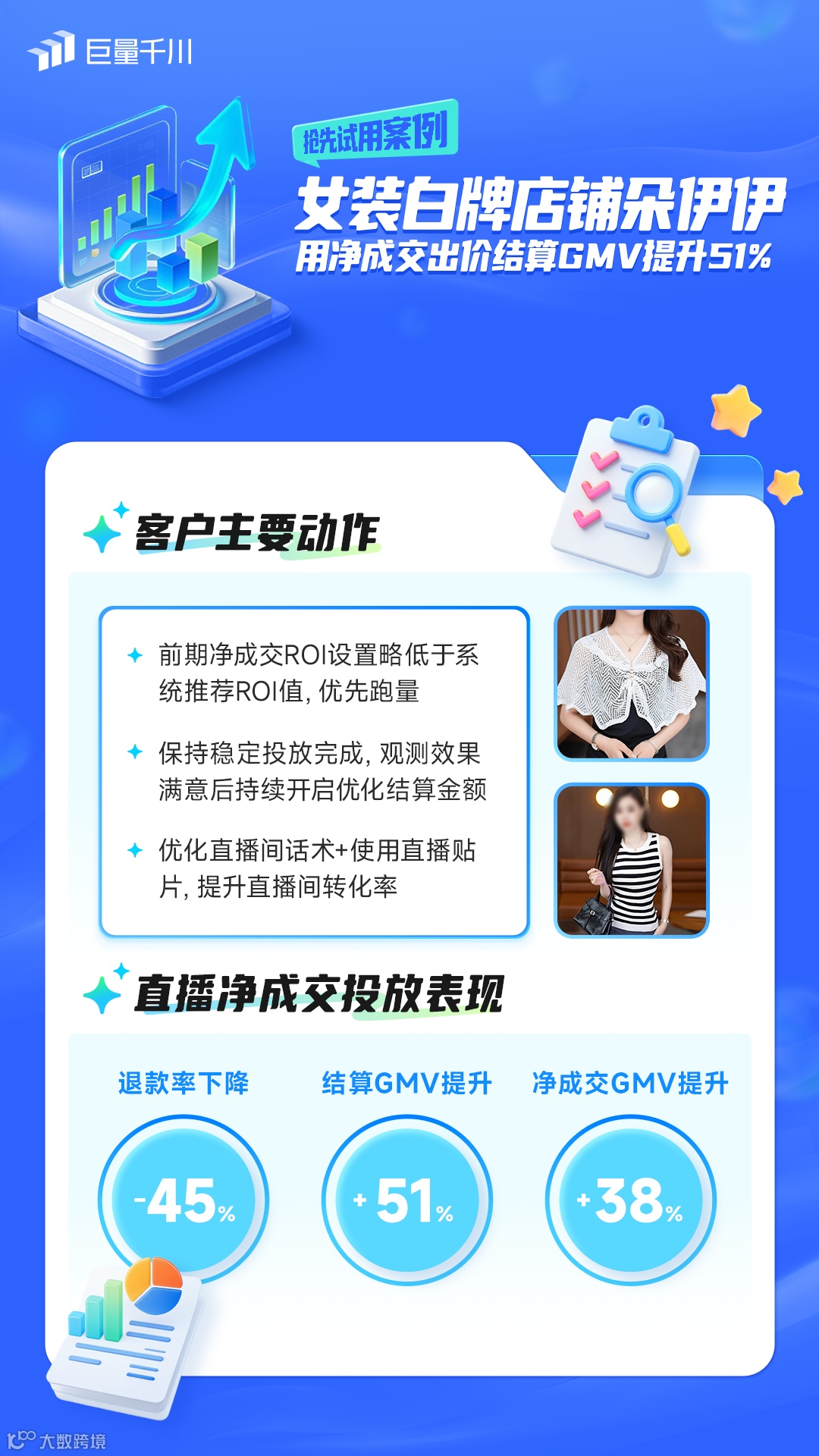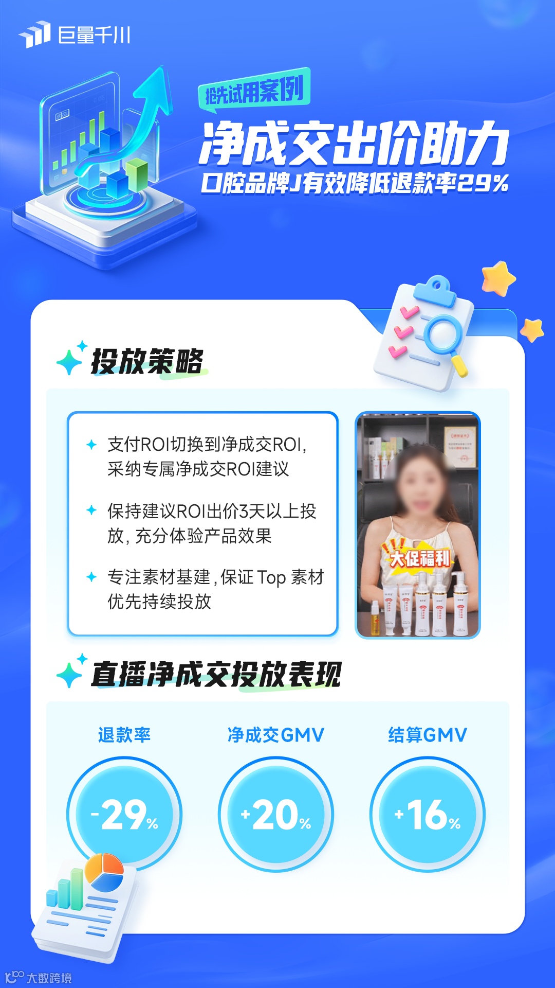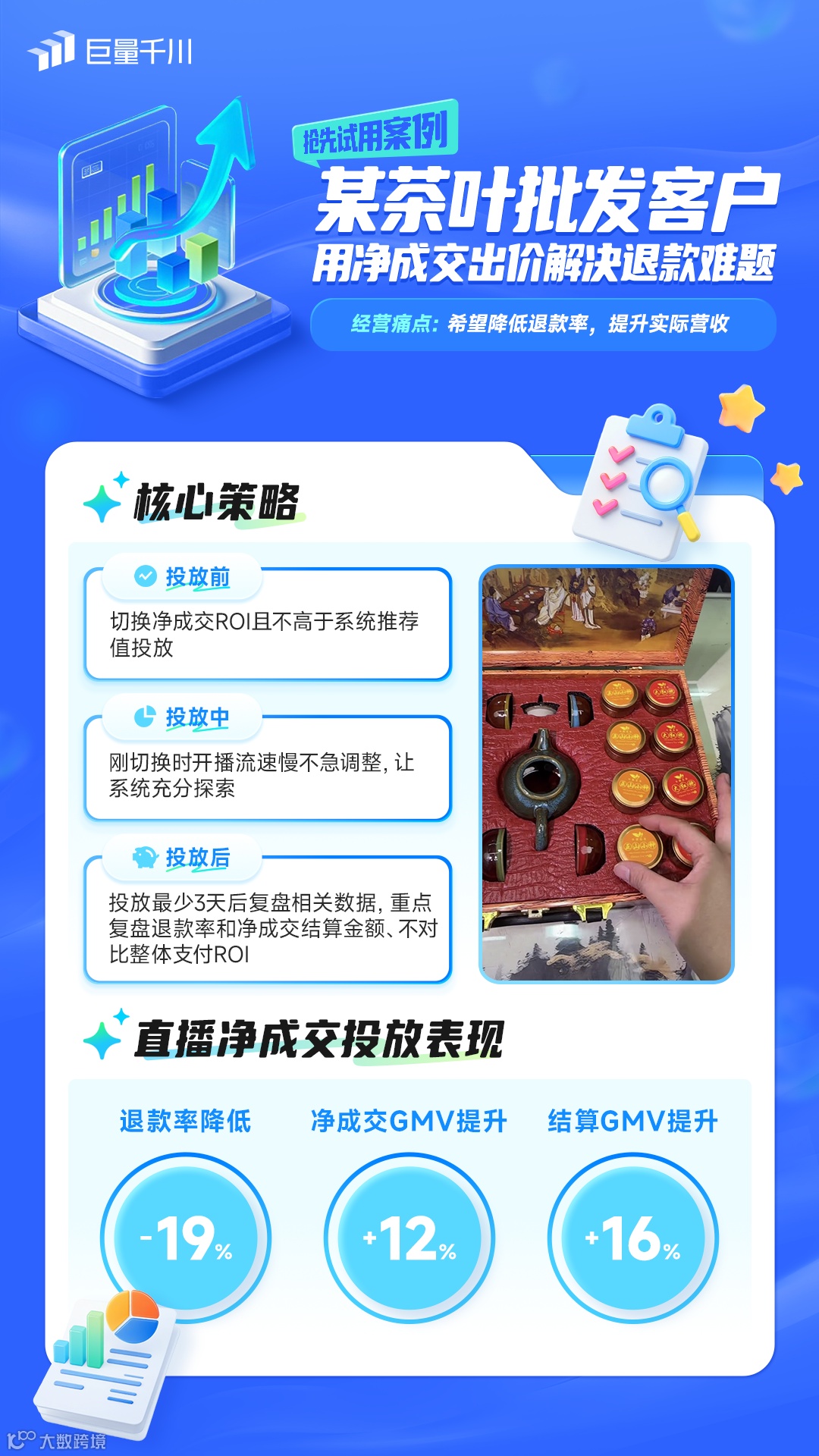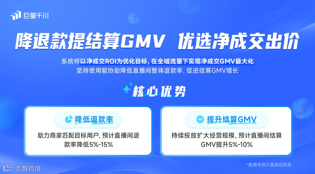 为进一步契合商家长期经营目标,助力商家实时优化退款率与结算GMV,巨量千川直播全域推广正式全量上线净成交ROI出价!