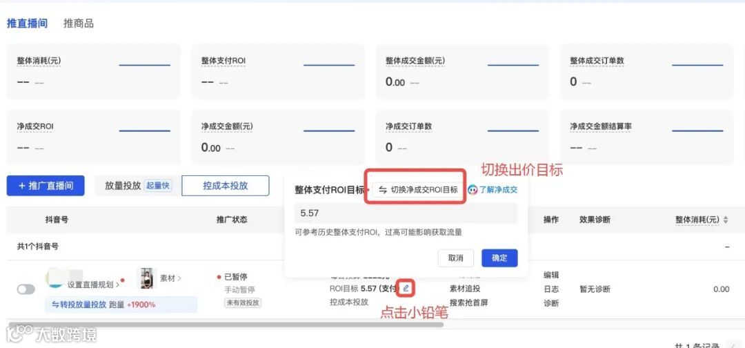 可在直播全域-控成本投放下,新建计划选择【切换净成交ROI目标】;也可以在计划列表页,修改已有计划的出价目标为净成交出价。
