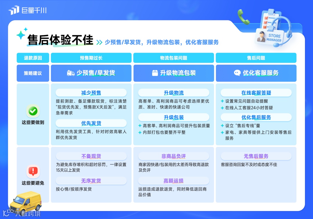 「售后体验不佳」 >> 少预售/早发货,升级物流包装,优化客服服务