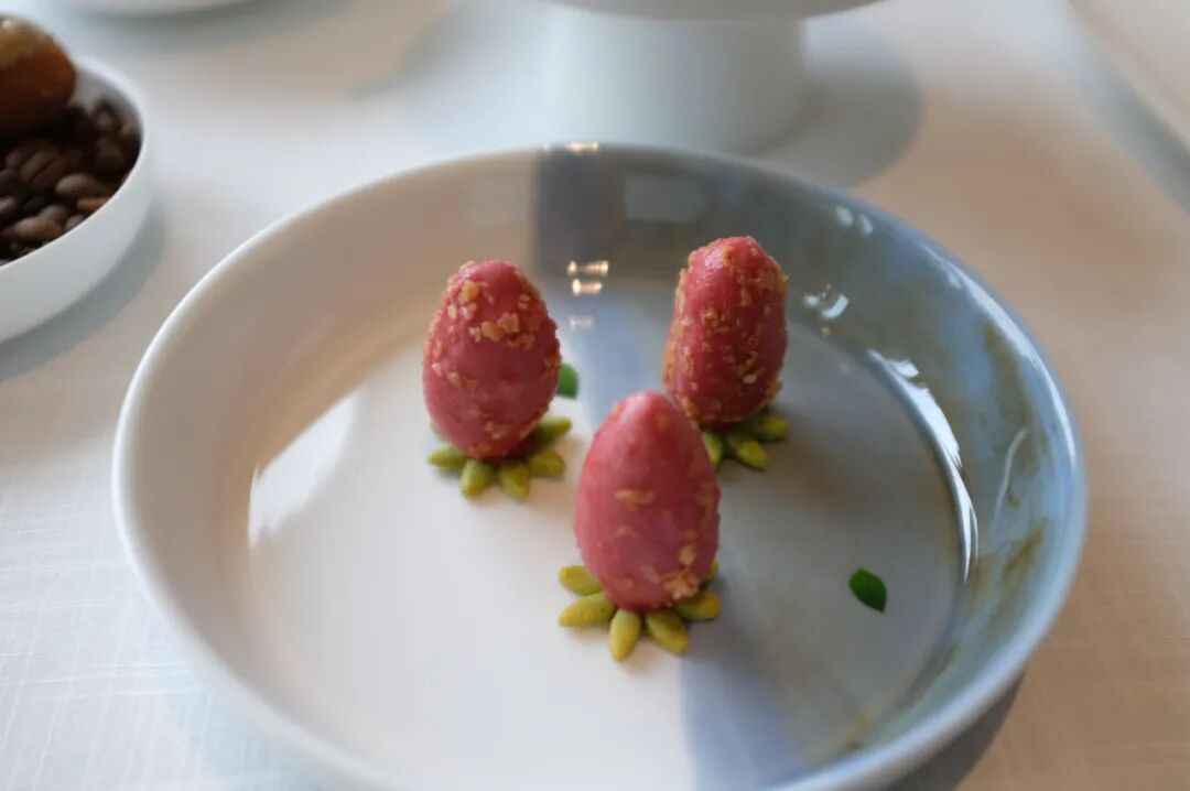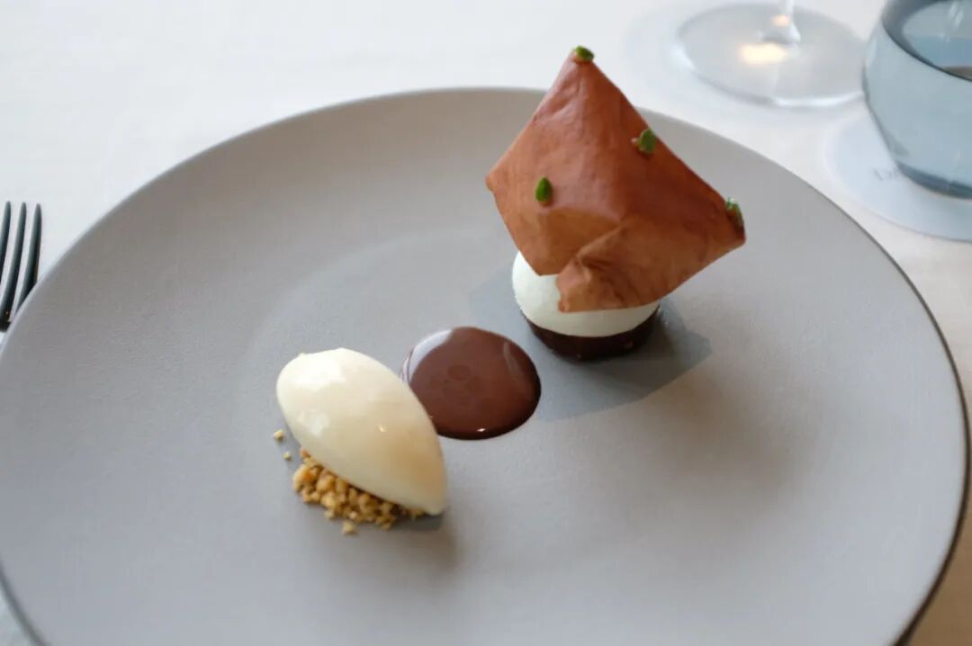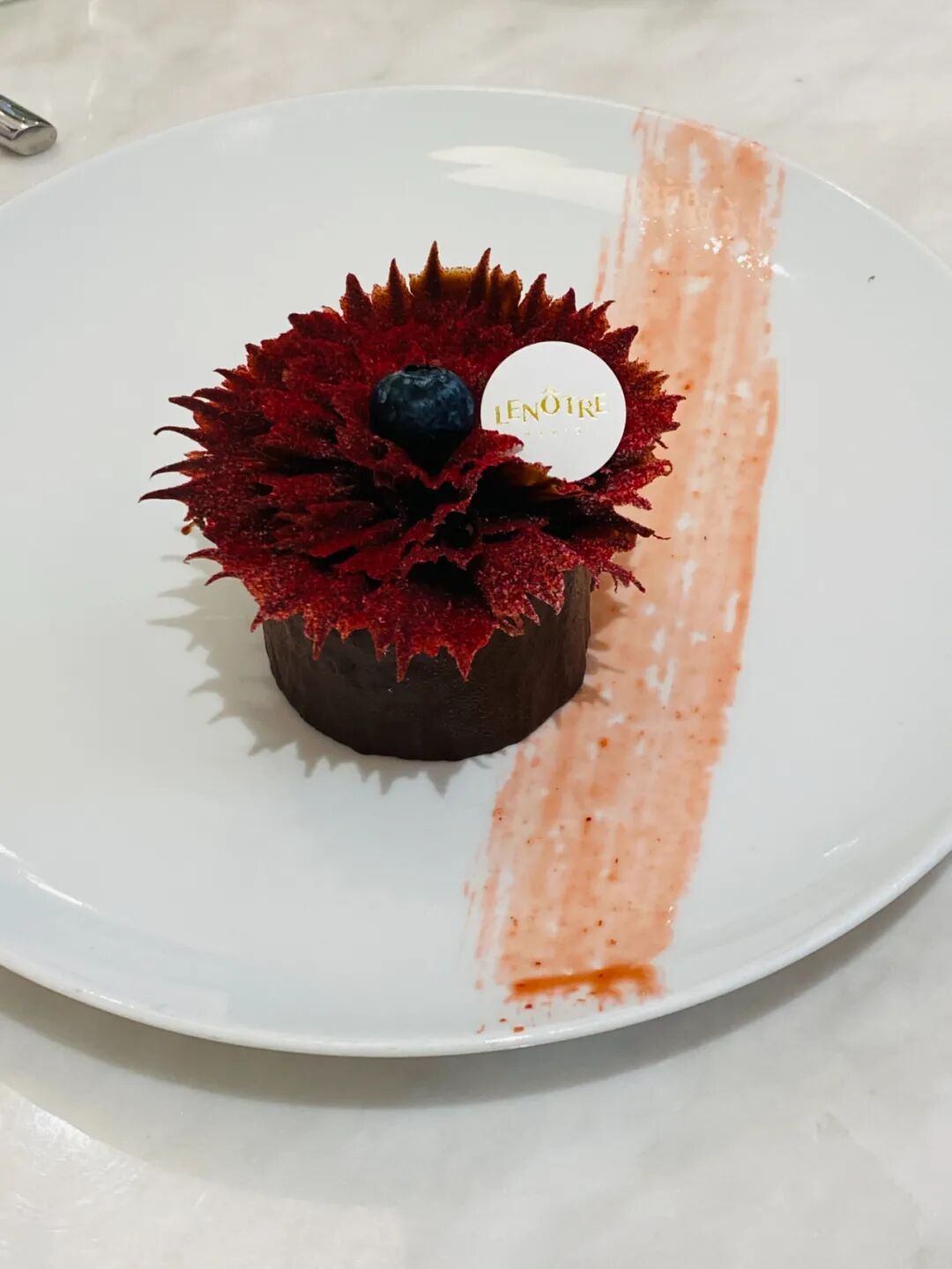 La Feuille d’automne秋叶,有着绽放姿态,似乎浸染了时光的酣然美态,极具造型感的甜点透露着艺术雕塑之美。巧克力慕斯以及时令红果酱营造出了丰富的口感。