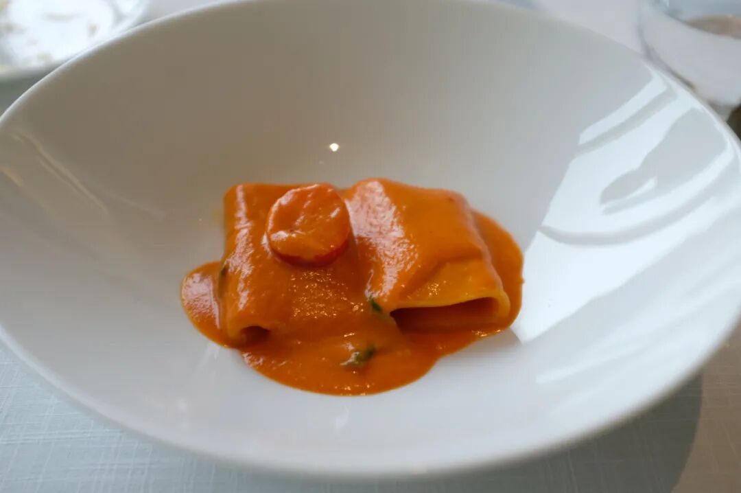东京,上海,巴黎,人生如旅程的兜转,也是因为上海的宽广,让很多有趣的灵魂在这里予人启迪。聊到兴头上,DA VITTORIO的每一道菜肴好像都为我们的谈话搭配了七窍生烟的一种趣味和底色。我们享受着意大利菜肴的骄纵恣意,当我吃到起源自意大利南部的管面Paccheri,四种番茄混合调制的酱汁入口,醇厚与充满嚼劲,所以要反复细品,一个白色的儿童围兜被围在胸前,上面用意大利语写着Oggi sono goloso(我是大胃王!),乖张,酣畅,有自我沉醉,还有一份被娇宠的意味。这也许就是我热爱大都市生活的因由:被现实的丰盈与创意所包裹的生活,让人感受到一种便捷又扎实可亲的细密。