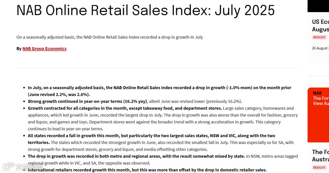 据NAB估算,截至7月的12个月内,澳洲线上零售额达648.8亿澳元,约占社会零售总额的14.6%,同比增长13.9%。线上零售增速仍明显快于整体市场。